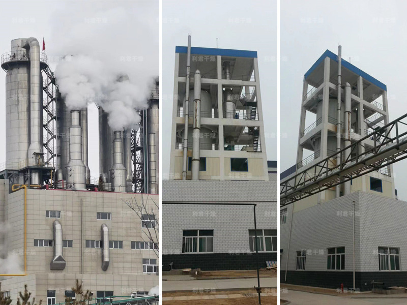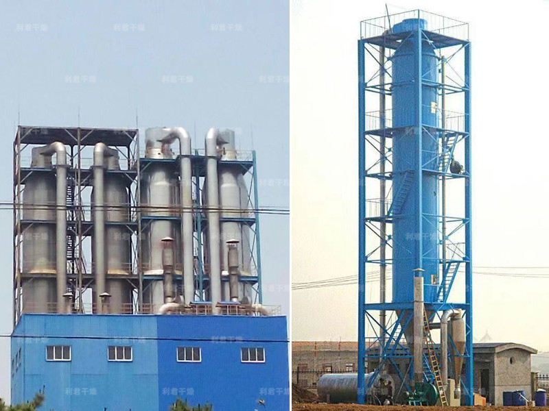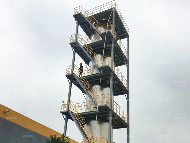 本機組工作過程為料液通過隔膜泵高壓輸入,噴出霧狀液滴,然后同熱空氣并流下降,大部分粉粒由塔底排料口收集,廢氣及其微小粉末經旋風分離器分離,廢氣由抽風機排出,粉末由設在旋風分離器下端的授粉筒收集,風機出口還可裝備二級除塵裝置,回收率在96-98%以上。